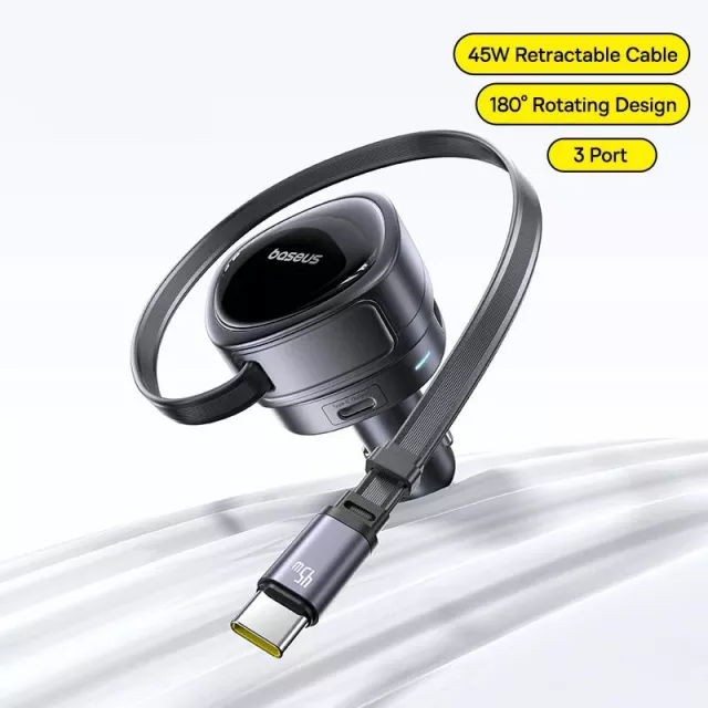 This charger delivers a total output of up to 60W, allowing you to power a laptop, phone, and accessories all at once. It includes one built-in fast-charging Type-C cable, one additional Type-C port, and one USB-A port. The head rotates 180° so you can direct the charger toward the front or back seats for easy access. The retractable cable stretches up to about 31 inches for flexible use, then smoothly winds back in for a clean, tidy setup.