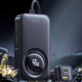 60W 3-Port Car Charger with Retractable Cable & 180° Rotating Head